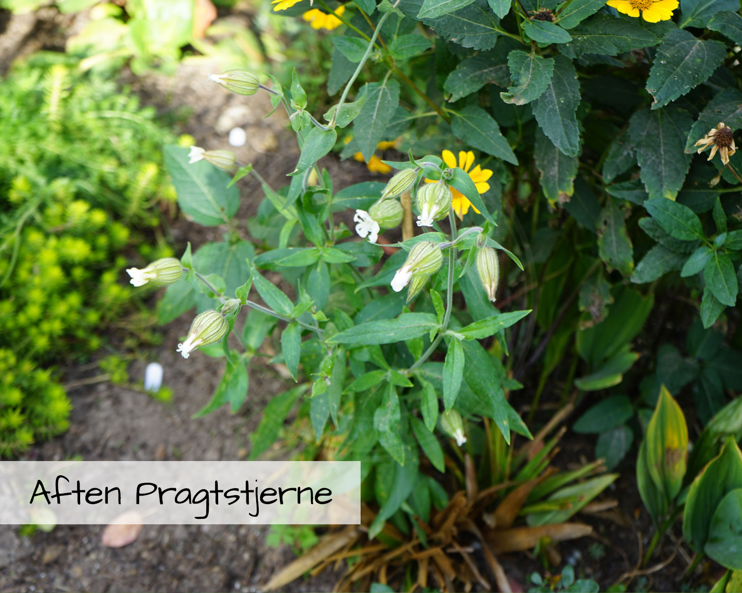 Et- og toårige: Aften-Pragtstjerne, Silene latifolia ssp. Alba – Almindelig Pengeurt, Thlaspi arvense – Hyrdetaske, Capsella bursa-pastoris – Læge-kokleare, Cochlearia officinalis – Løgkarse, Alliaria petiolata – Vellugtende Kamille, Matricaria recutita – Vild Gulerod, Daucus carota ssp. Carota