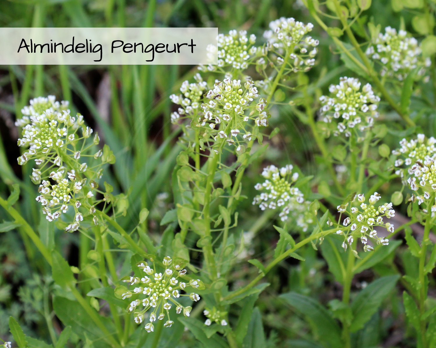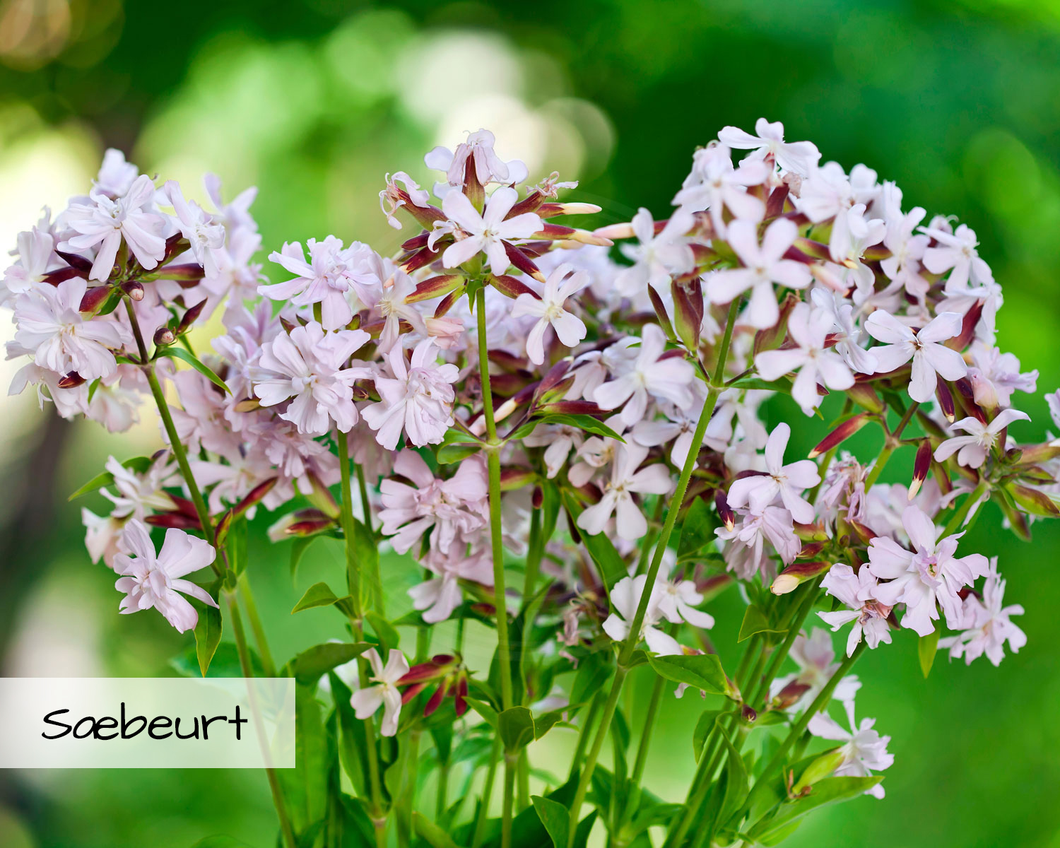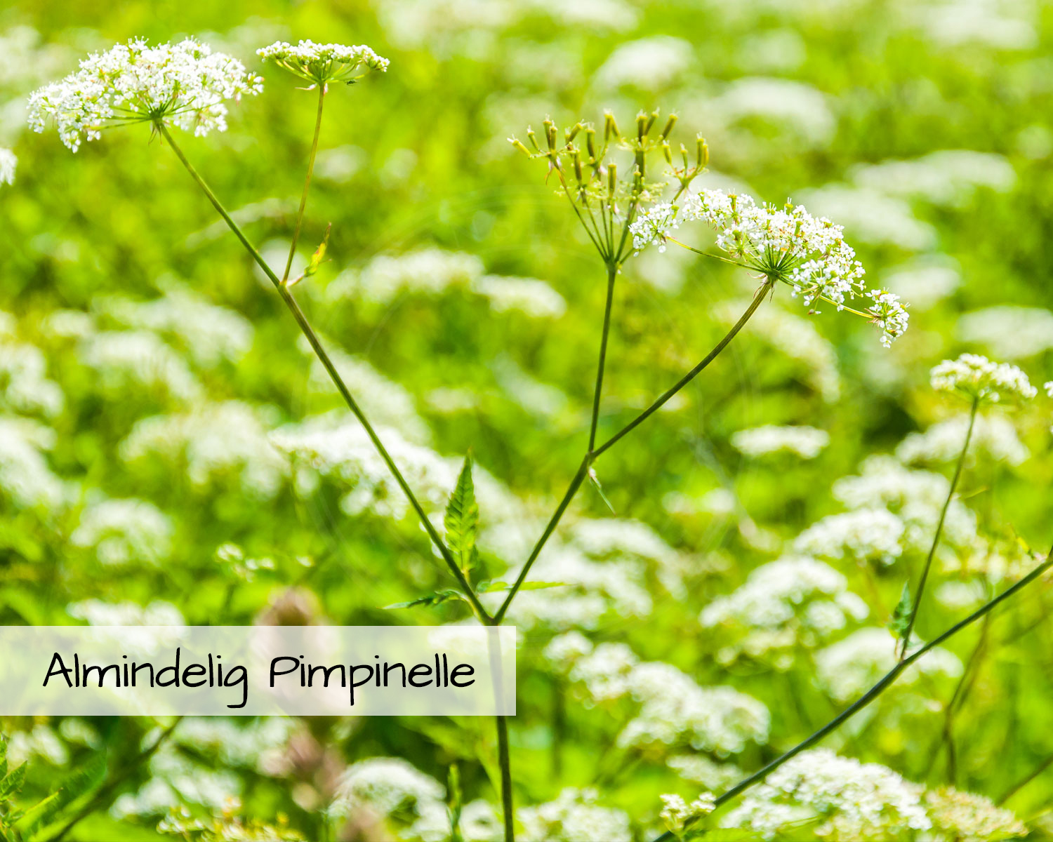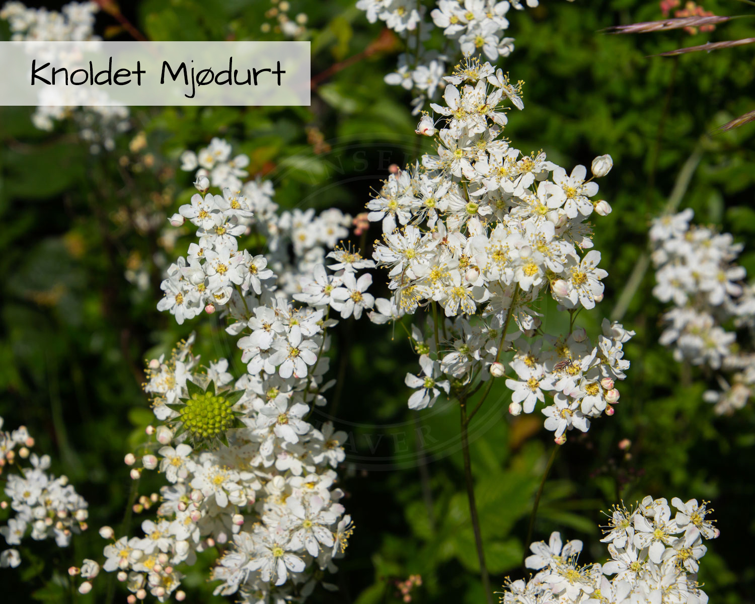 Flereårige: Almindelig Mjødurt, Filipendula ulmaria – Almindelig Pimpinelle, Pimpinella saxifraga – Hvid-Kløver, Trifolium repens – Hvid Okseøje, Leucanthemum vulgare – Knoldet Mjødurt, Filipendula vulgaris – Læge-Baldrian, Valeriana officinalis – Læge-Stokrose, Althaea officinalis – Sæbeurt, Saponaria officinalis – Vild Kørvel, Anthriscus sylvestris