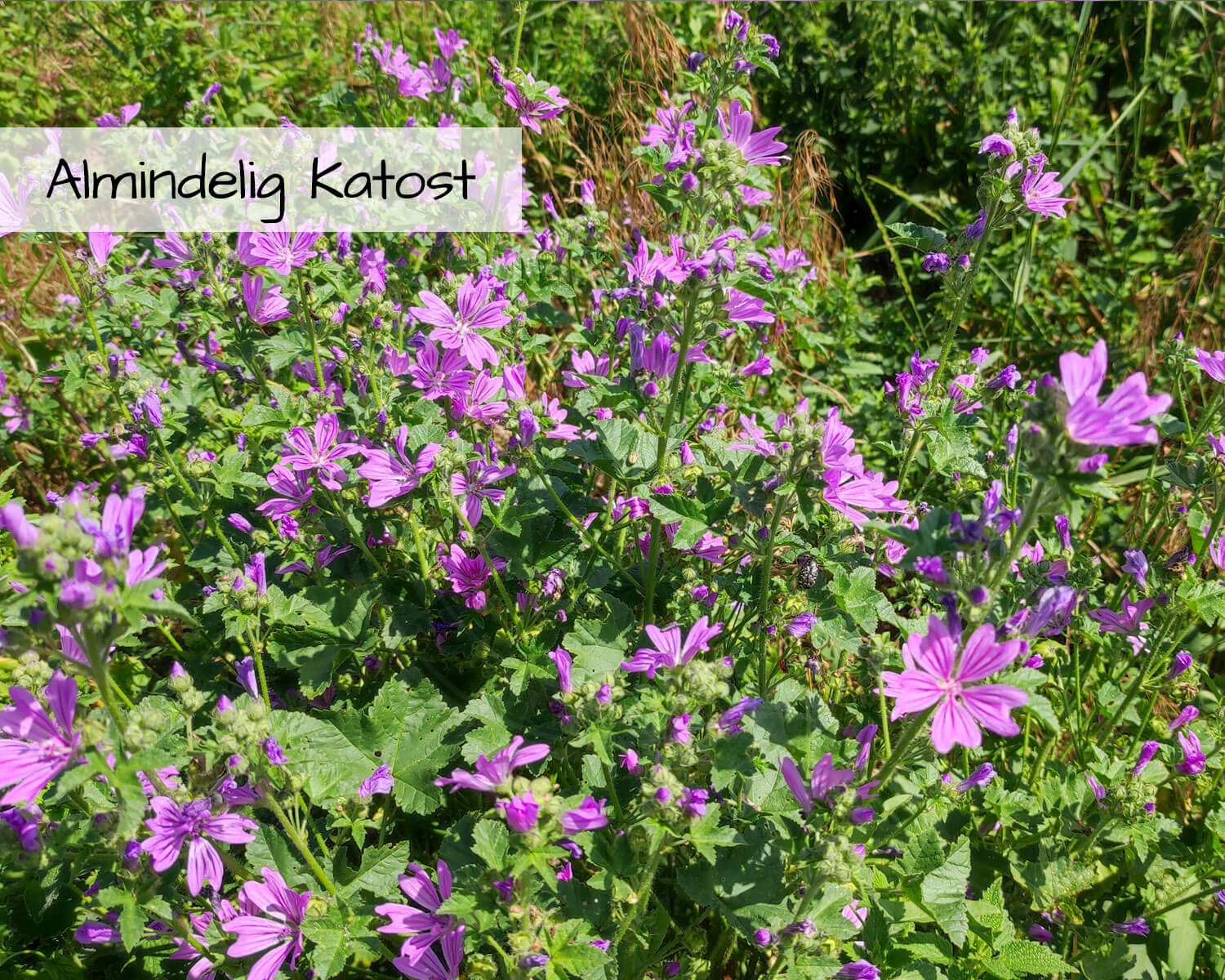 Flerårige blomster: Almindelig Katost, Malva sylvestris – Almindelig Knopurt, Centaurea jacea – Almindelig Røllike, Achillea millefolium